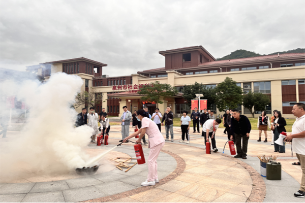 会后,组织开展模拟火灾事故应急演练。演练开始,现场模拟火灾突发紧急情景,启动紧急呼叫系统,工作人员迅速响应,第一时间赶赴现场开展疏散和救援工作,引导服务对象有序撤离到空旷场所。随后现场设置火盆进行灭火演练,消防服务公司工作人员向参会人员讲解灭火器的使用方法、操作要领并传授运用消防灭火器扑救火灾的技能。在专业人士的指导下,参训人员按照规范消防器材的实践操作,扑灭火患。